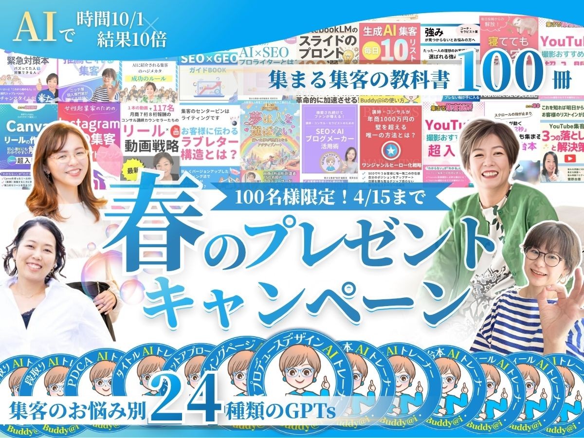 集まる集客カレッジ4人の講師から、GPTSや小冊子の活用方法などメールマガジンでお届けいたしますので予めご了承ください。