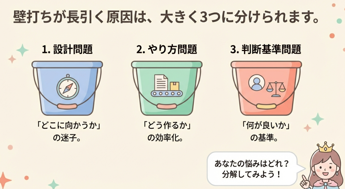 壁打ちが長引く原因は、大きく3つです。