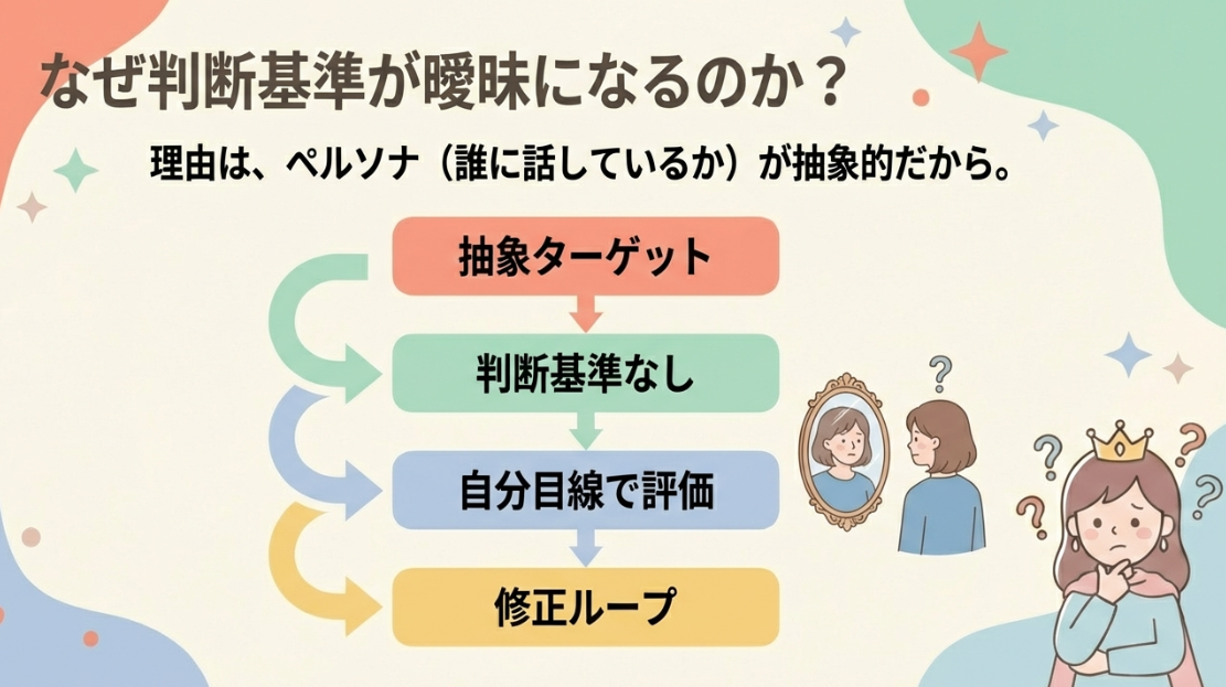 | 判断基準問題 | 評価軸が曖昧 | 直しても不安 |