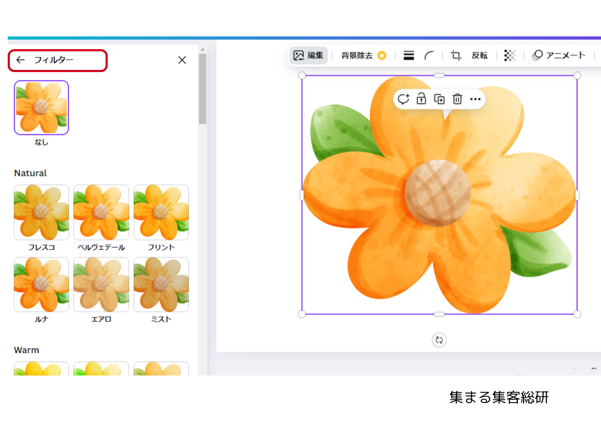 Canvaのフィルター機能は、写真や素材全体の色味やトーンを調整するために便利なツールです。以下の手順で簡単に使えます: