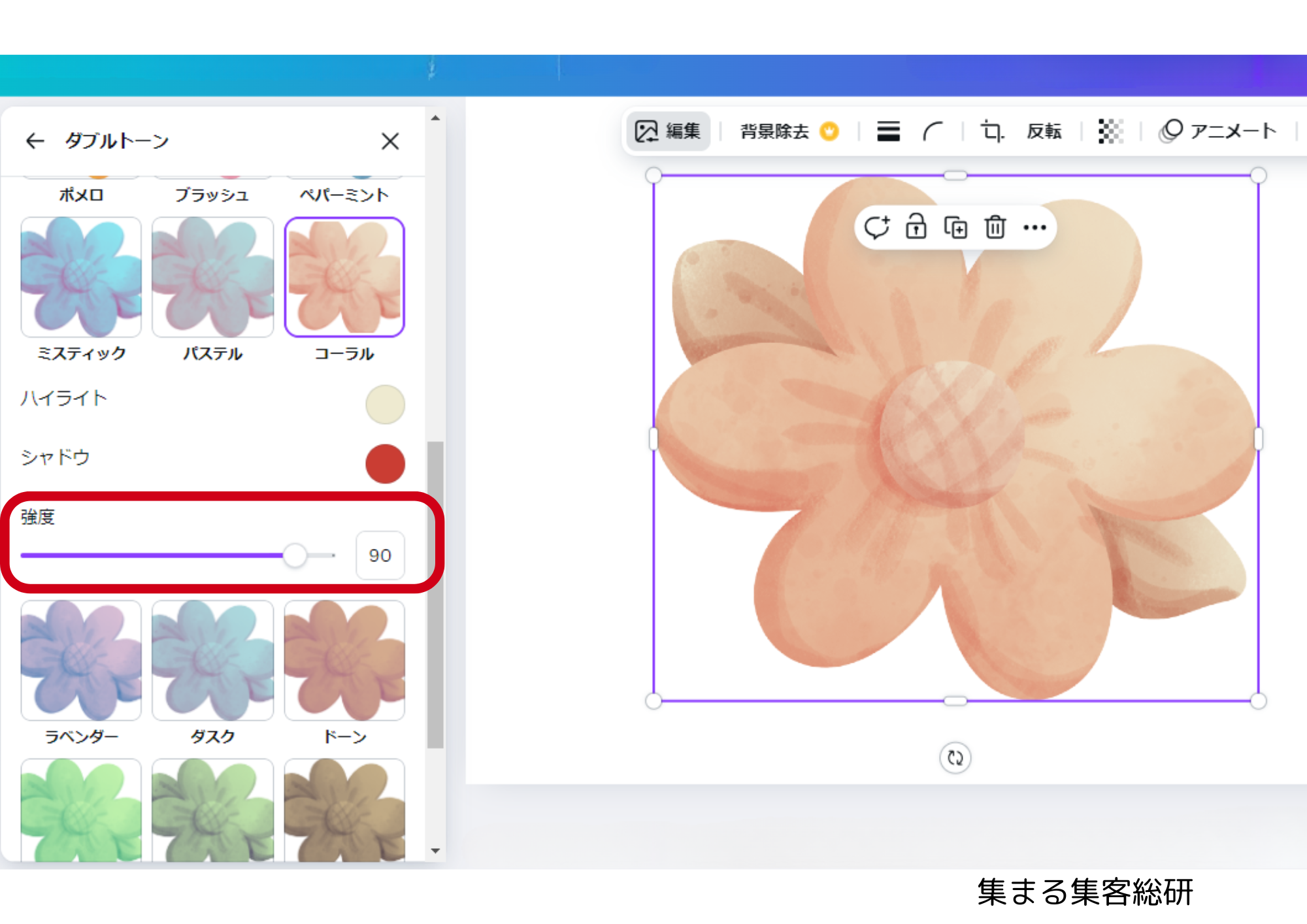 「ダブルトーン」は、2つの色を組み合わせて素材を大胆にアレンジできる機能です。ポスターやSNS用デザインに使うと、一気に洗練された印象を与えることができます。以下の手順で試してみましょう: