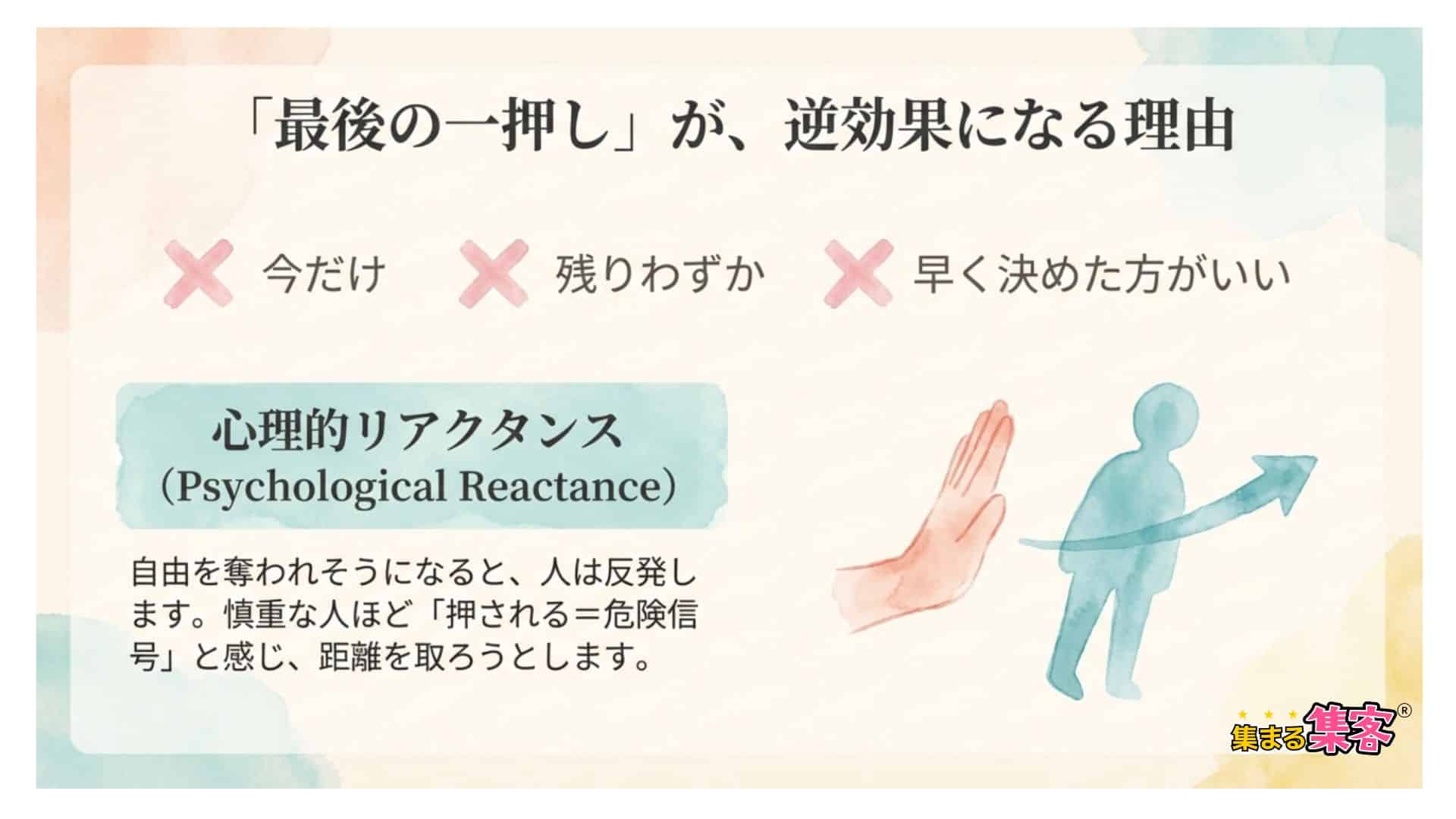 この層は、ただ優柔不断なのではなく、「決めるための条件が多い」「安心を求めている」だけなんです。けれども、その心理を理解せずに“最後のひと押し”をしてしまうと、逆に信頼を失ってしまうことも…。