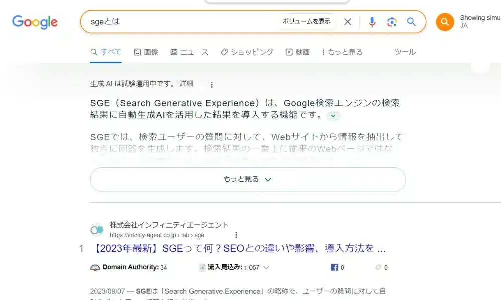これでSGEが有効になり、普段の検索結果の上部にSGEが表示されるようになるよ。