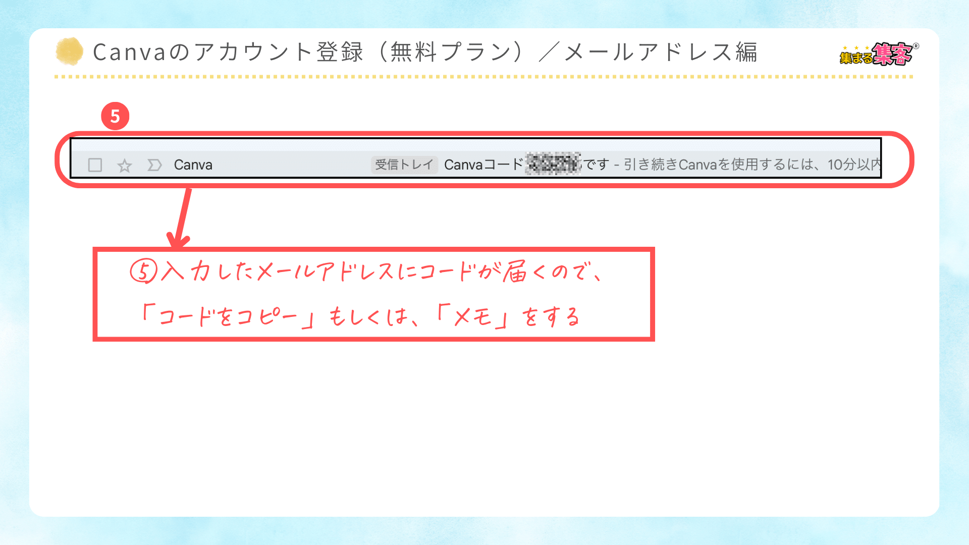 ⑤入力したメールアドレスにCanvaからコードが届くので、「コードをコピー」もしくは、「メモ」をする