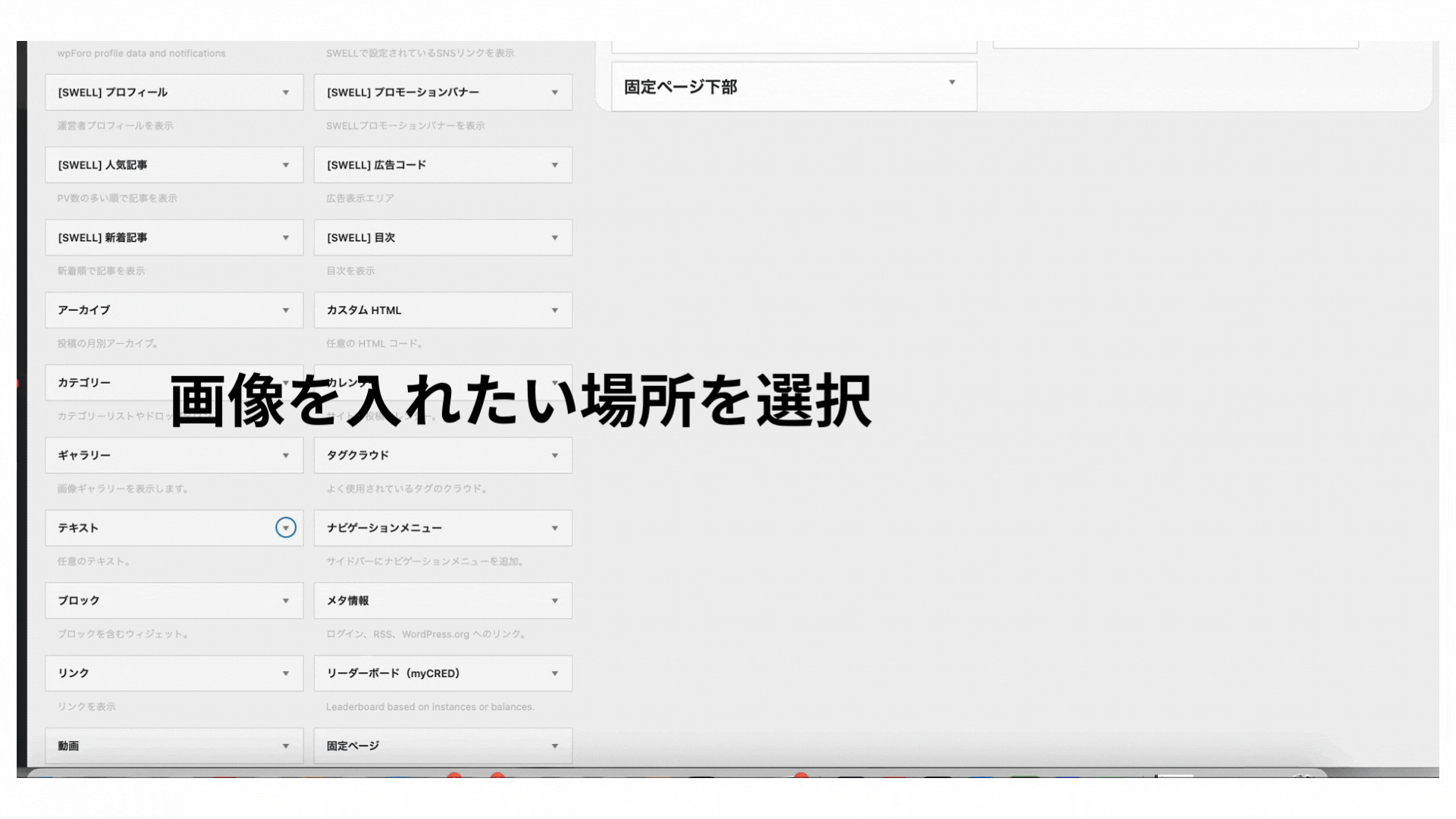 ウィジェット設定で「テキスト」を選んで、画像を挿入しましょう。画像を選択した後、リンクを入れることもできます。