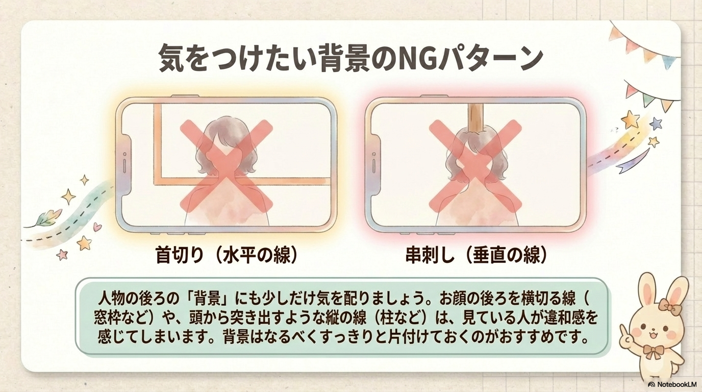 - 串刺しショット:頭から柱や木が垂直に伸びているように見える構図。被写体の印象が薄れるだけでなく、古くから縁起が悪いと忌避されます。