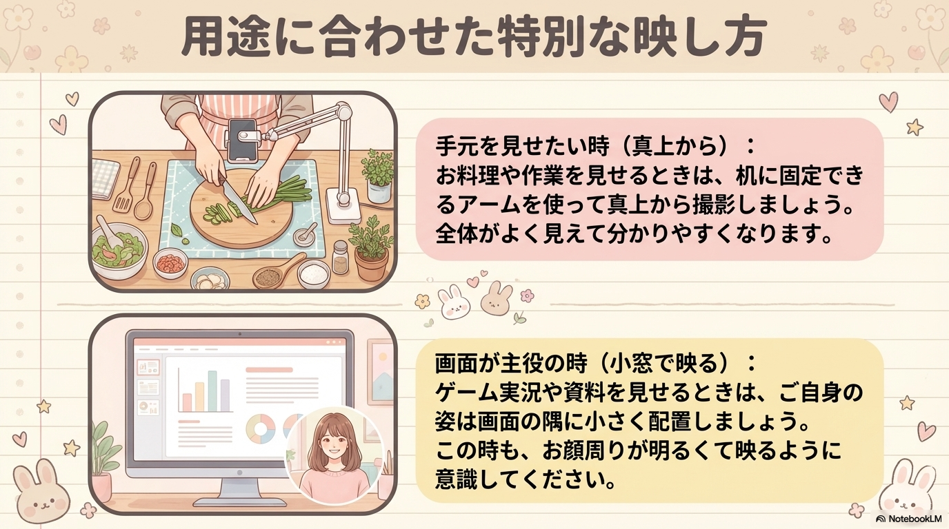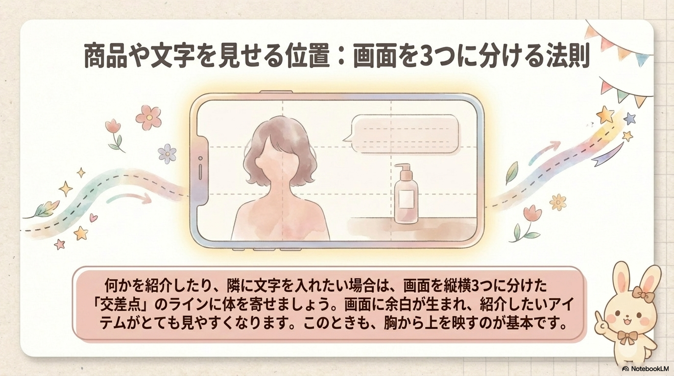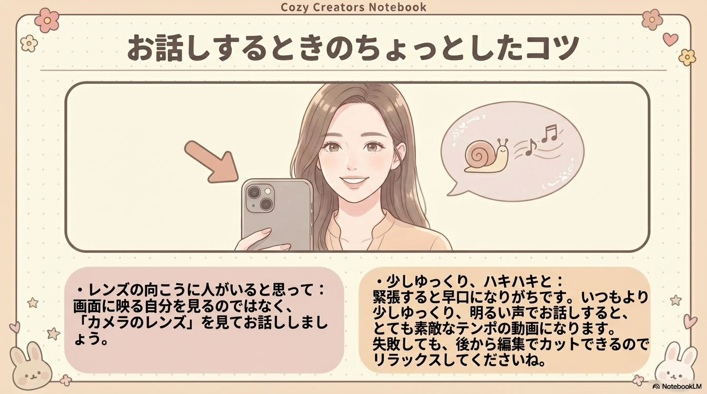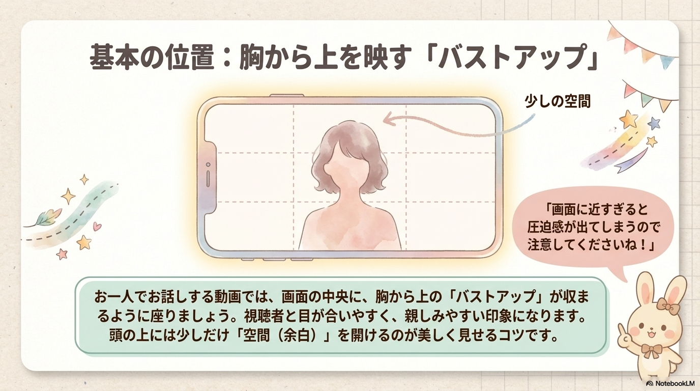 初心者がまずマスターすべきはアイレベルです。視聴者と同じ目線に立つことで、言葉が最も真っ直ぐに届く「信頼の距離感」を構築できます。