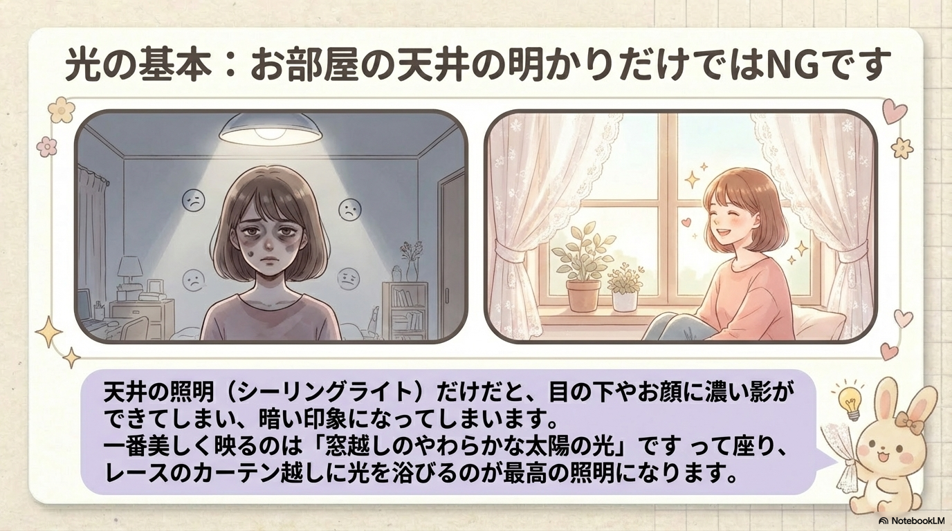 部屋のシーリングライトは通常、被写体の真上や後ろに位置します。これでは顔に不自然で深い影(鼻の下や目の窪み)ができたり、逆光になったりしてしまいます。また、スマホのカメラセンサーは光が不足するとISO感度が上がり、画面にザラザラした「ノイズ」が発生します。適切なライティングは、センサーの性能を最大限に引き出すための必須条件なのです。