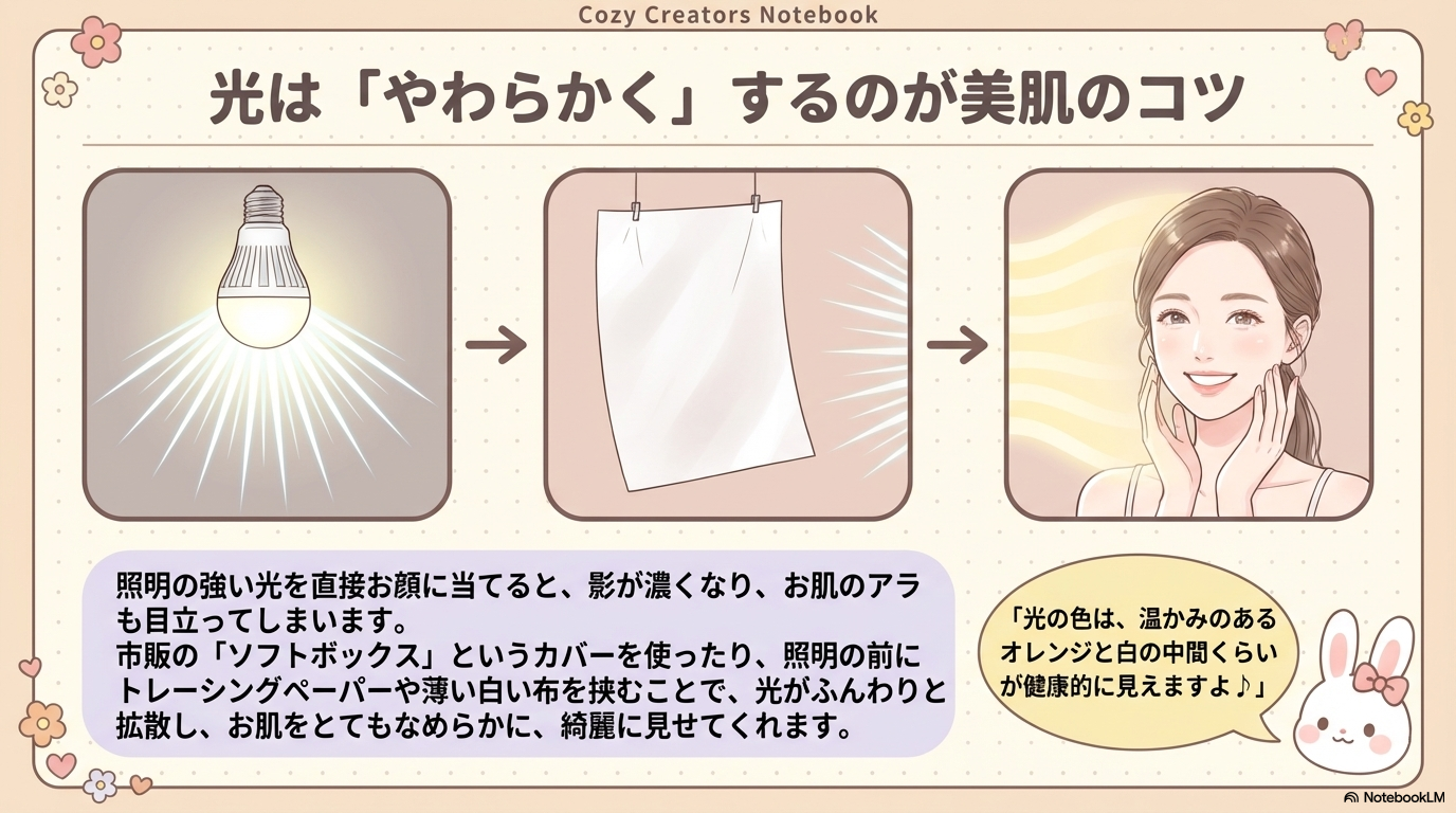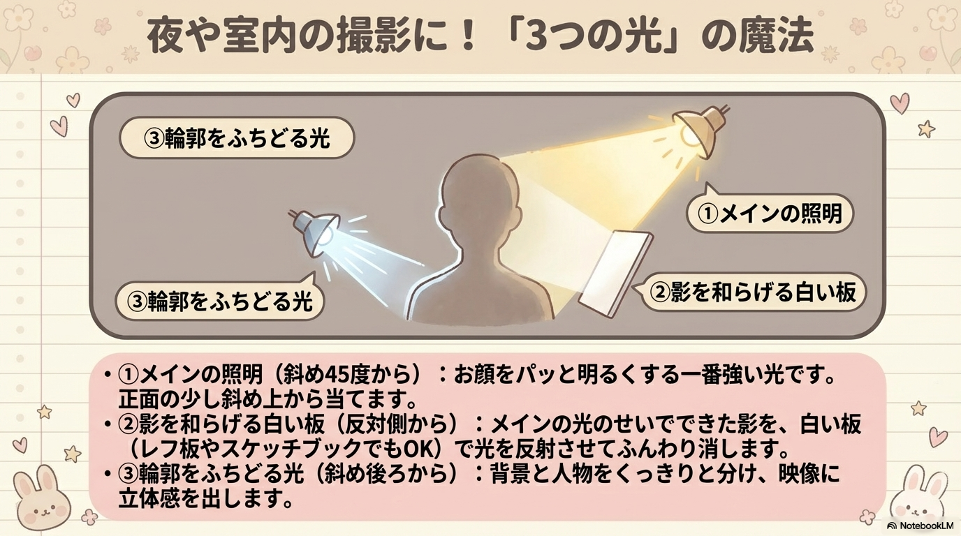 - フィルライト:キーライトの反対側から当て、影を和らげる補助光。100円ショップの白いカラーボードや厚紙をレフ板として代用するだけでも劇的な効果があります。
