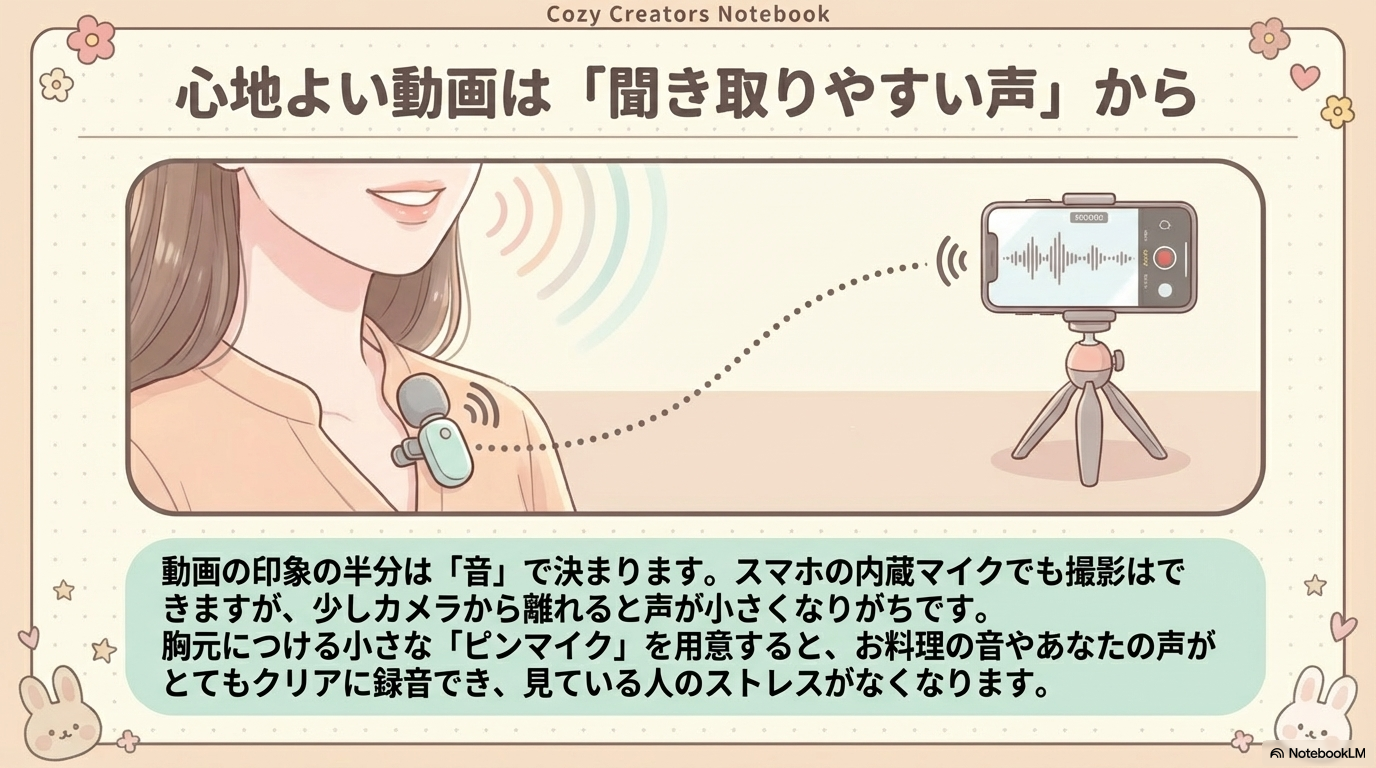 スマホの内蔵マイクには限界があります。クリアな声を届けるためには、ピンマイクなどの外付けマイクの使用が最も効率的な投資になります。