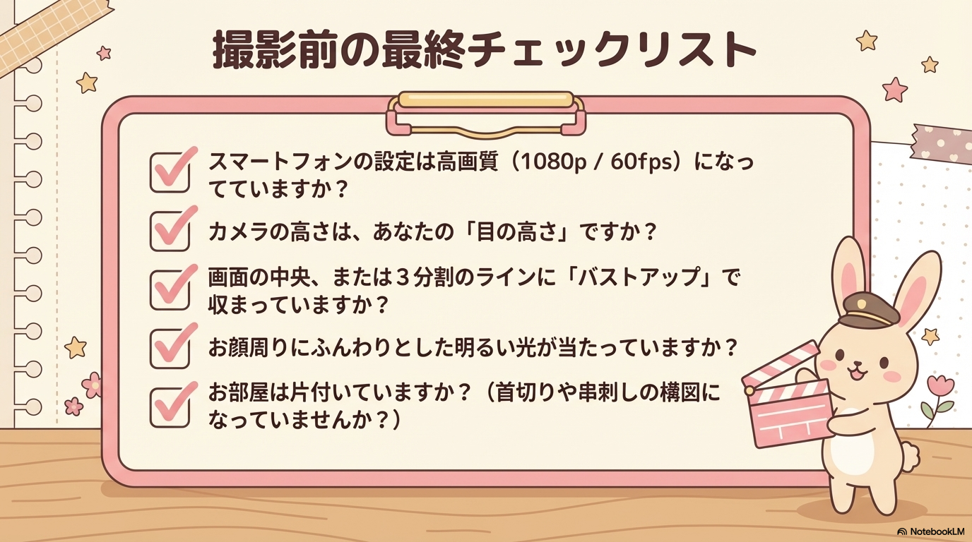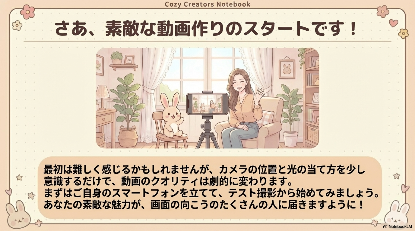 「機材のせいでクオリティが低い」と言い訳をするのは今日で終わりにしませんか?あなたの次の動画で、今回お伝えした「論理」を一つだけ試してみてください。視聴者の反応がどう変わるか、楽しみで仕方なくなるはずですよ!